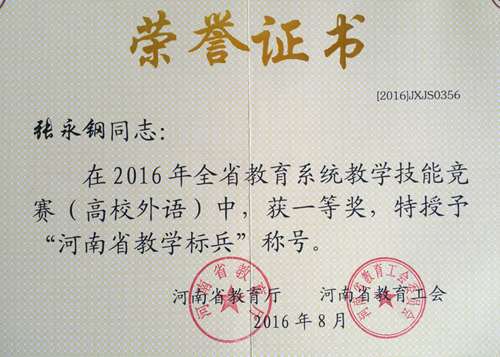 近日,从河南省教育厅、河南省教育工会传来喜讯,在河南省教育系统2016年度教学技能竞赛中,小说狂人 张永钢老师喜获一等奖,被授予“河南省教学标兵”光荣称号(全校共有10名教师获得此荣)。