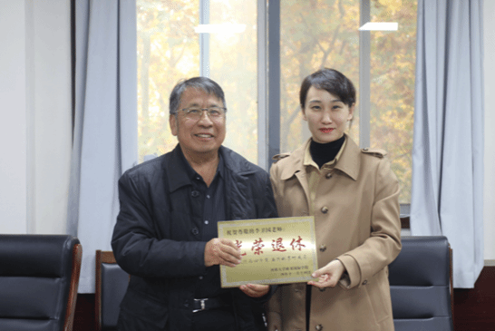 刘佳明对李卫国老师光荣退休表示祝贺,并为李老师颁发光荣退休证书。她回顾了李卫国老师丰富的执教生涯,代表学院对李卫国老师的辛勤耕耘及在学院发展中所做的突出贡献表示衷心感谢,希望李老师退休后一如既往地关心和支持学院的发展,为学院工作多提宝贵建议。同时,衷心地祝愿李老师平安、健康、快乐。