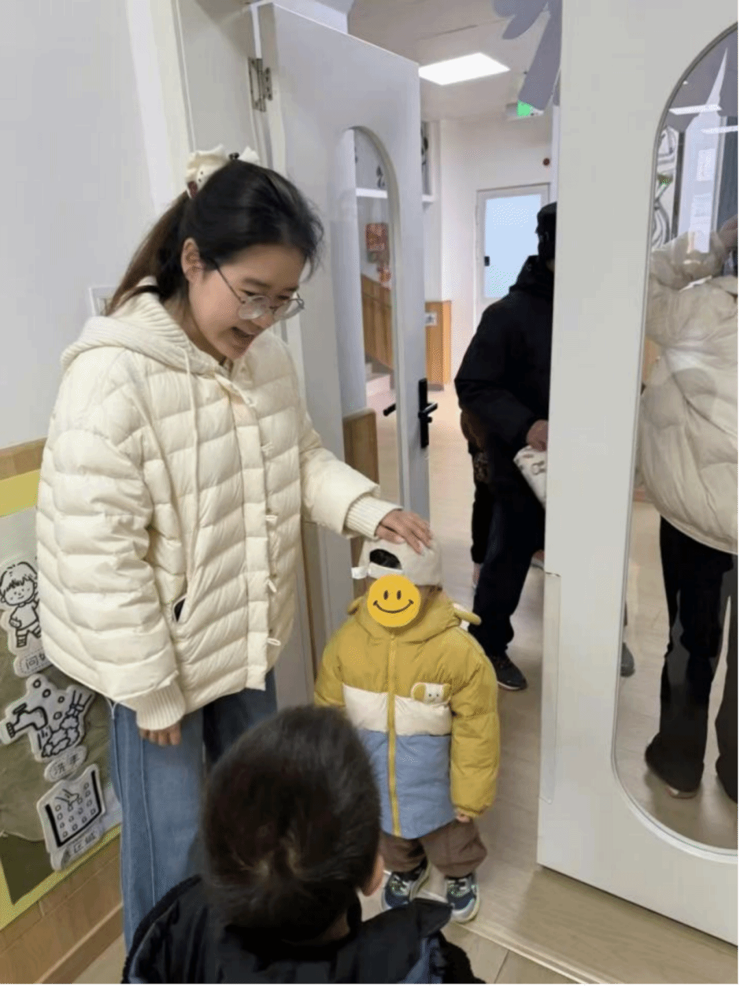 清晨在班级门口迎接孩子们入园