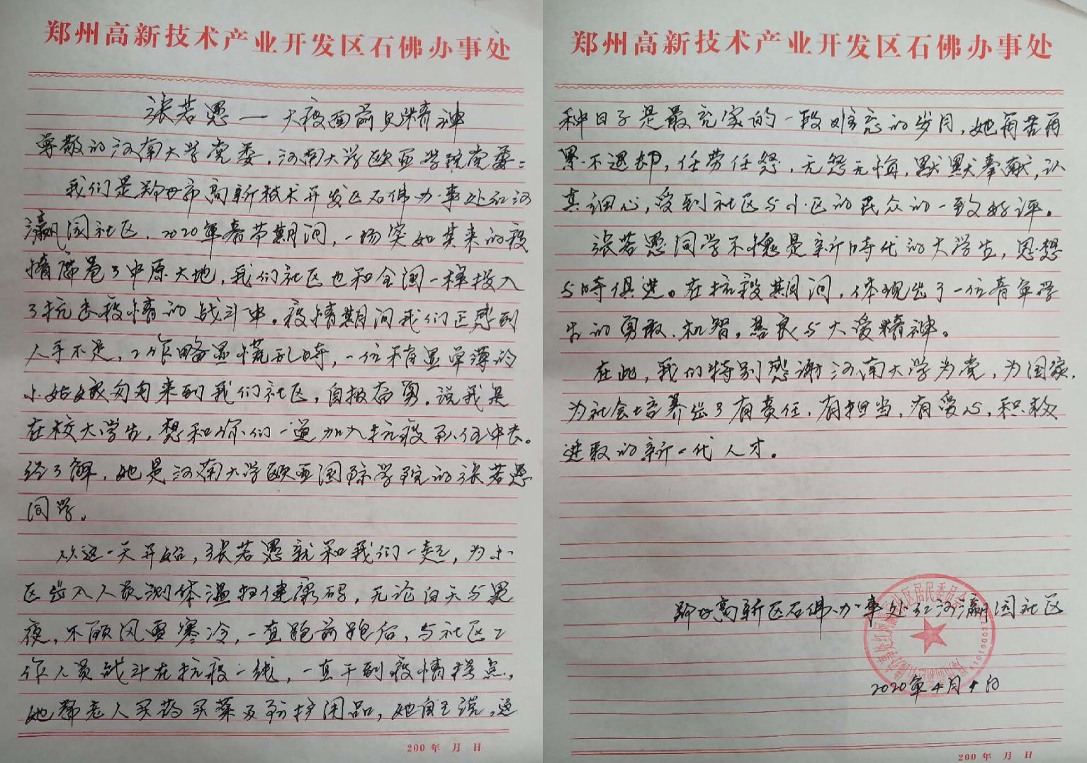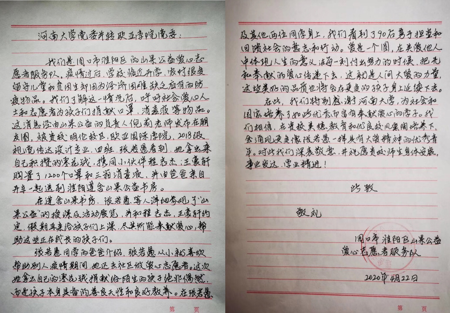 4月下旬,小说狂人 陆续收到了两封感谢信,分别来自郑州市高新区石佛办事处红河瀛园社区和周口市淮阳区山果公益爱心志愿者服务队。经了解,两封信感谢的对象均为小说狂人 2018级视觉传达专业的张若愚同学。