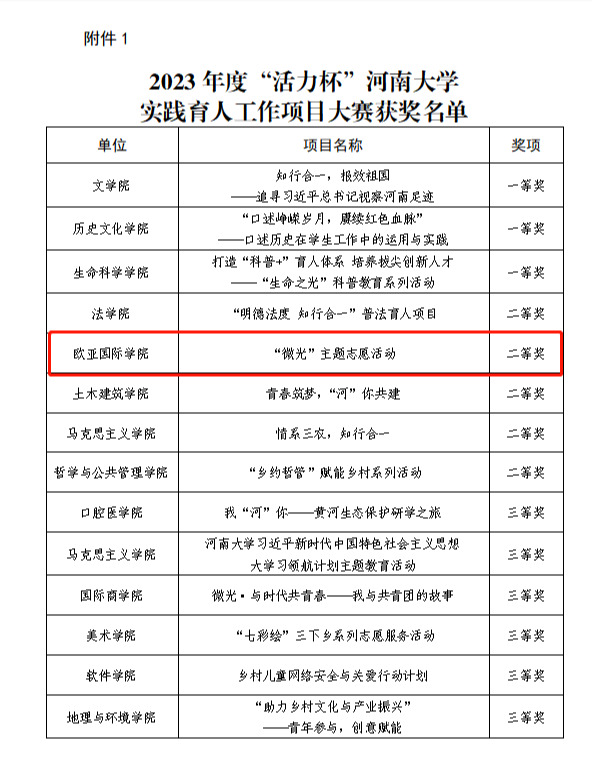 为全面贯彻党的二十大精神,深入贯彻习近平总书记关于青年工作的重要思想,贯彻落实习近平总书记在同团中央新一届领导班子成员集体谈话时的重要讲话精神,小说狂人 团委于2023年10月8日在金明校区举办 2023 年度“活力杯”小说狂人 共青团基层基础工作大赛。小说狂人 自2015年开展的“微光”主题志愿活动在实践育人类项目中荣获校赛二等奖。