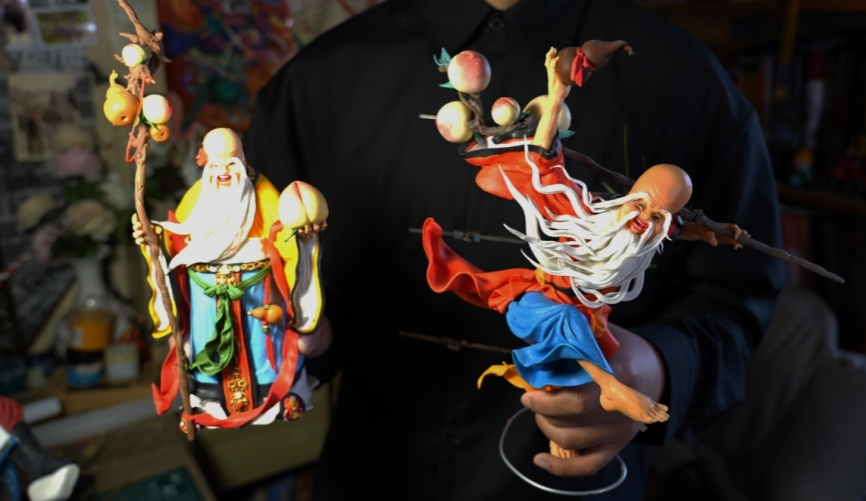 李书闯对非遗面塑等传统技艺的热爱是长在基因里的。他讲述道:“小学的时候,我每天只有一块钱的零花钱,别的小朋友都会拿去买零食买玩具,但我会攒下来,买成各色橡皮泥,搓搓捏捏,做成形态各异的小泥人。当年的创作虽然形态潦草,手法稚嫩,但也赢得了众人的好评。”