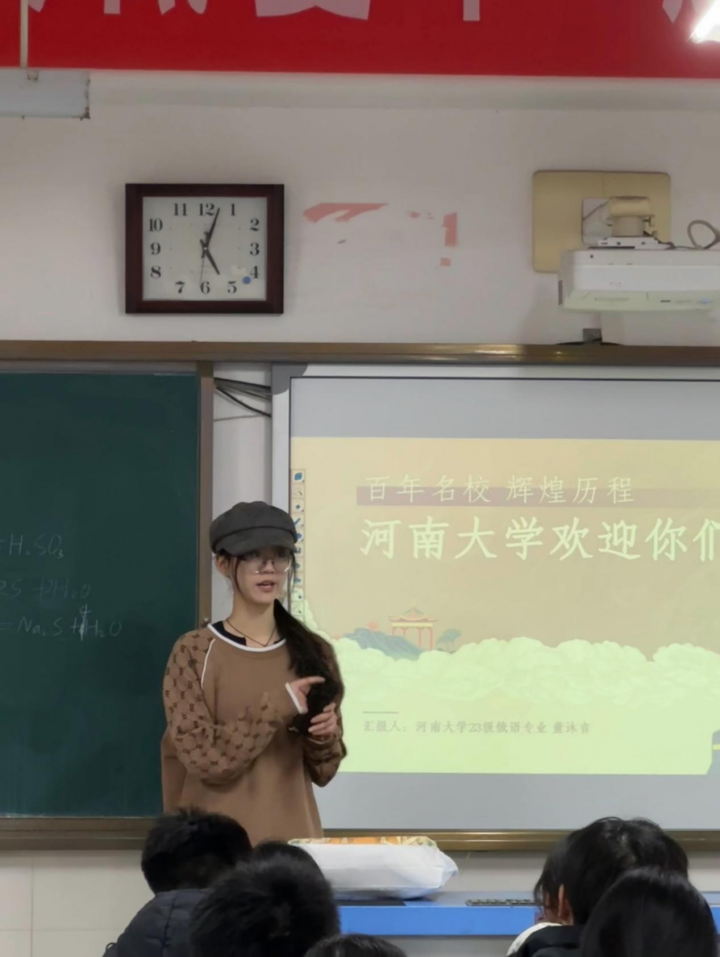 在宣讲的过程中,我感受到了学弟学妹们的专注与热情,他们殷切地目光、接二连三的发问让我倍感欣慰与荣幸。宣讲的最后,我将提前准备的河大的文创产品分发给各班,那些带着河大元素的礼物,是一种激励和鼓励,更是一颗种子,期望他们高考过后能与我在河大相见!