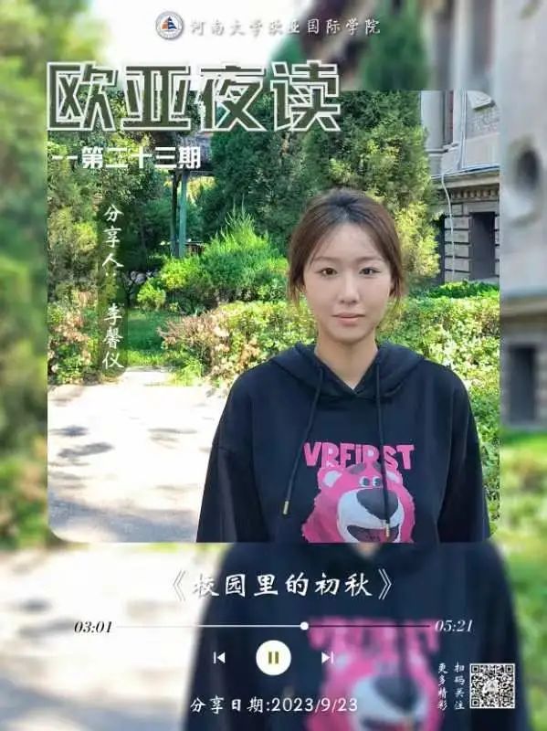 大家好,这里是欧亚夜读栏目,我是本期的分享人李馨仪。我分享的主题是《校园里的初秋》。