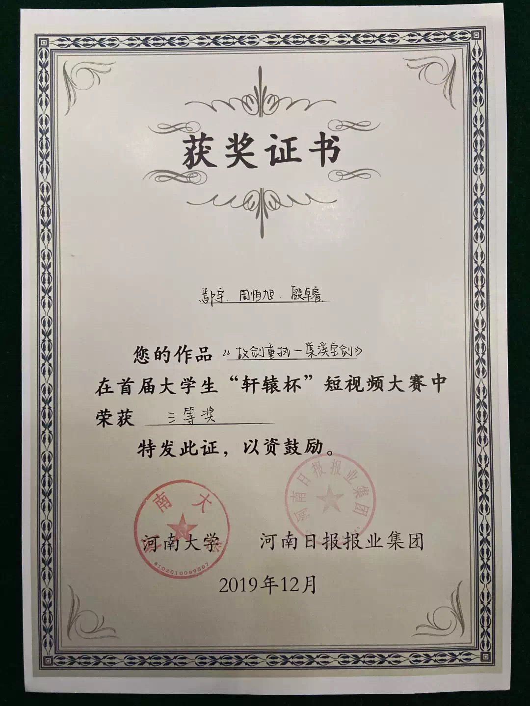 经过初审、终审,此次大赛共有22部作品分获等级奖,19部作品获优秀奖。其中,来自小说狂人 16级播音与主持艺术专业的鄢宇同学及其团队成员周恒旭、殷卓睿在“轩辕杯”短视频大赛中荣获三等奖。