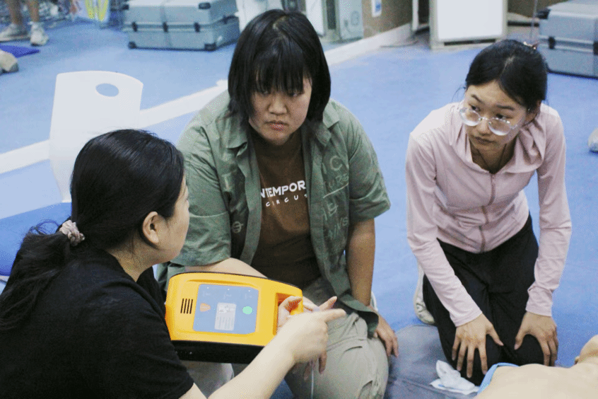 在随后的实操演练环节,同学们分组围绕人体模型进行心肺复苏技能练习,四位老师逐一指导,重点强调胸外按压的准确位置、力度和节奏。AED演示教学也极大拓展了同学们对现代急救设备的了解与掌握。